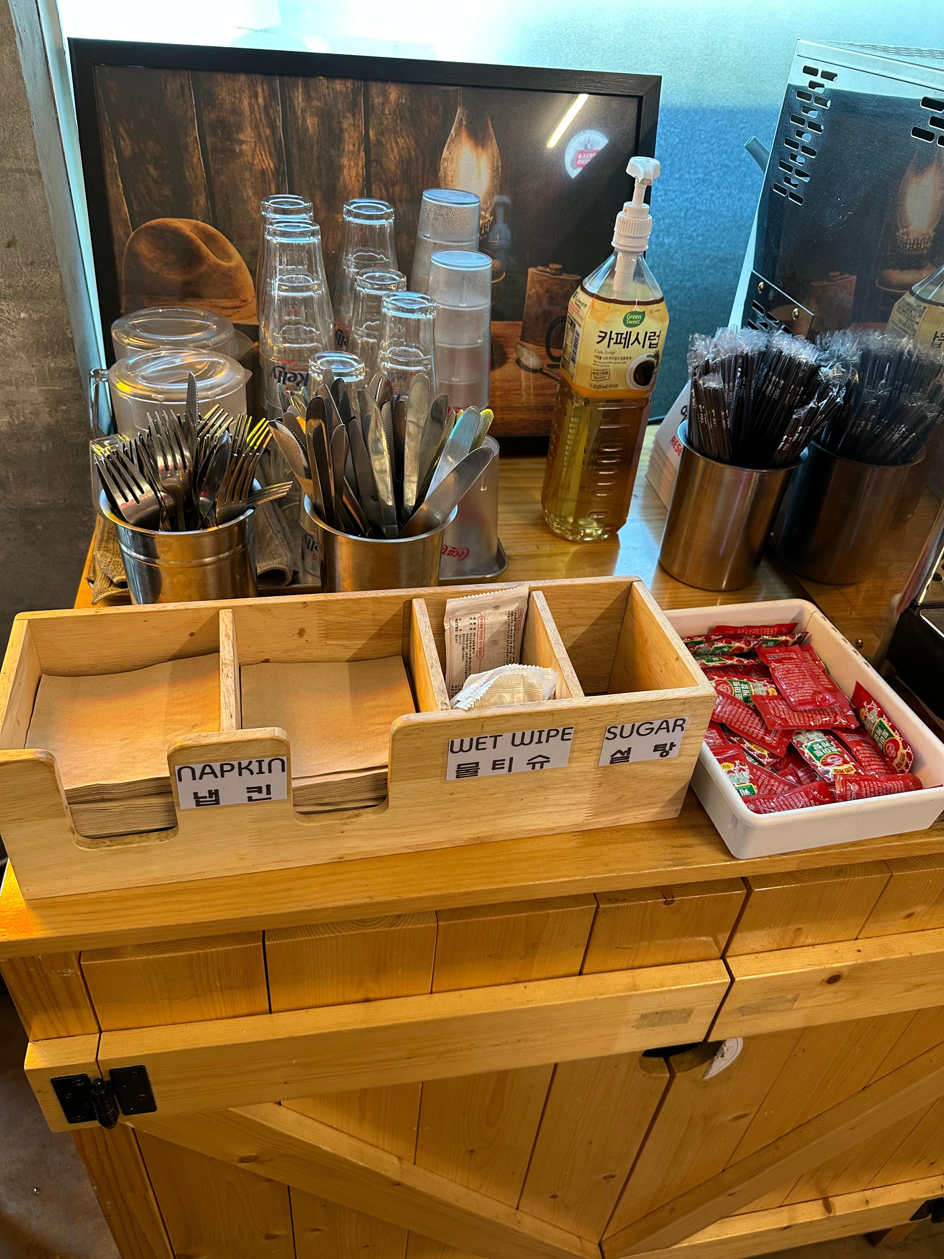 After ordering, if you look to the left of the counter, you’ll see a self-serve station with napkins, wet wipes, ketchup, forks, knives, straws, and even a beer tap!