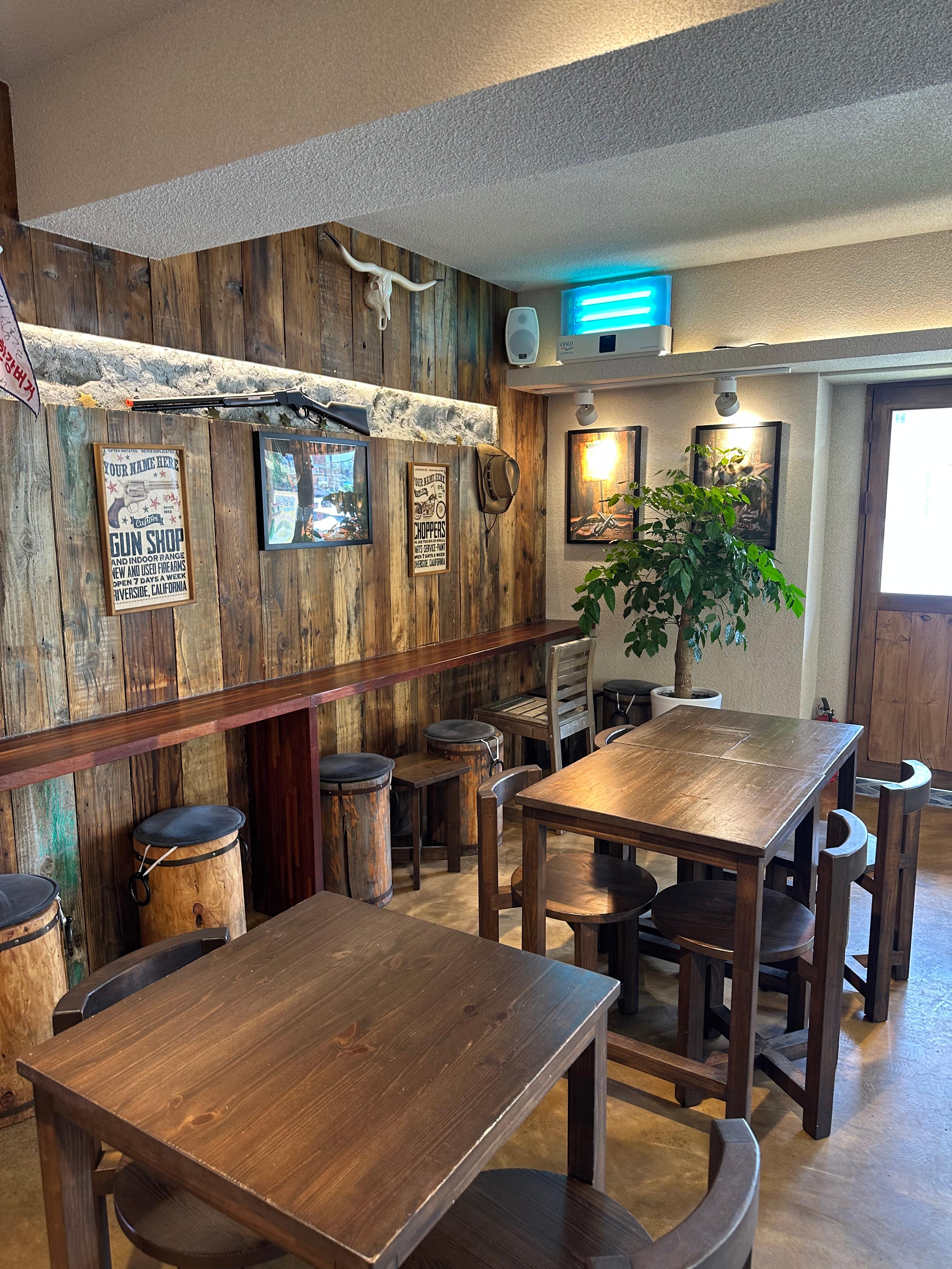 The interior also gives off strong cowboy vibes, with decorations like guns, cowboy hats, framed pictures, and rustic wooden tables and chairs.