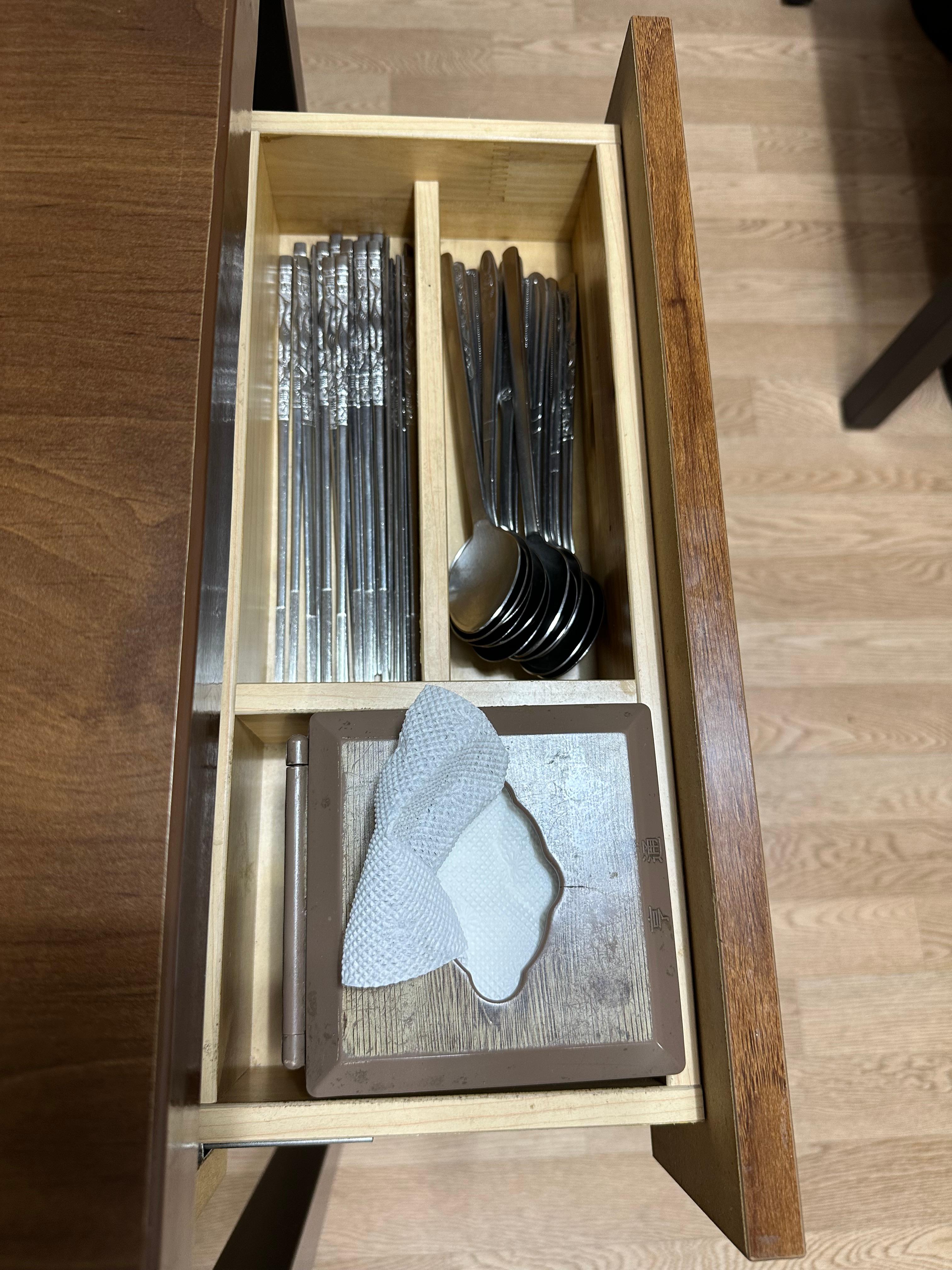 The utensils, as you can see in the photo below, are neatly stored in a side drawer at each table—right next to the tissues. Super convenient! 🥢🧻