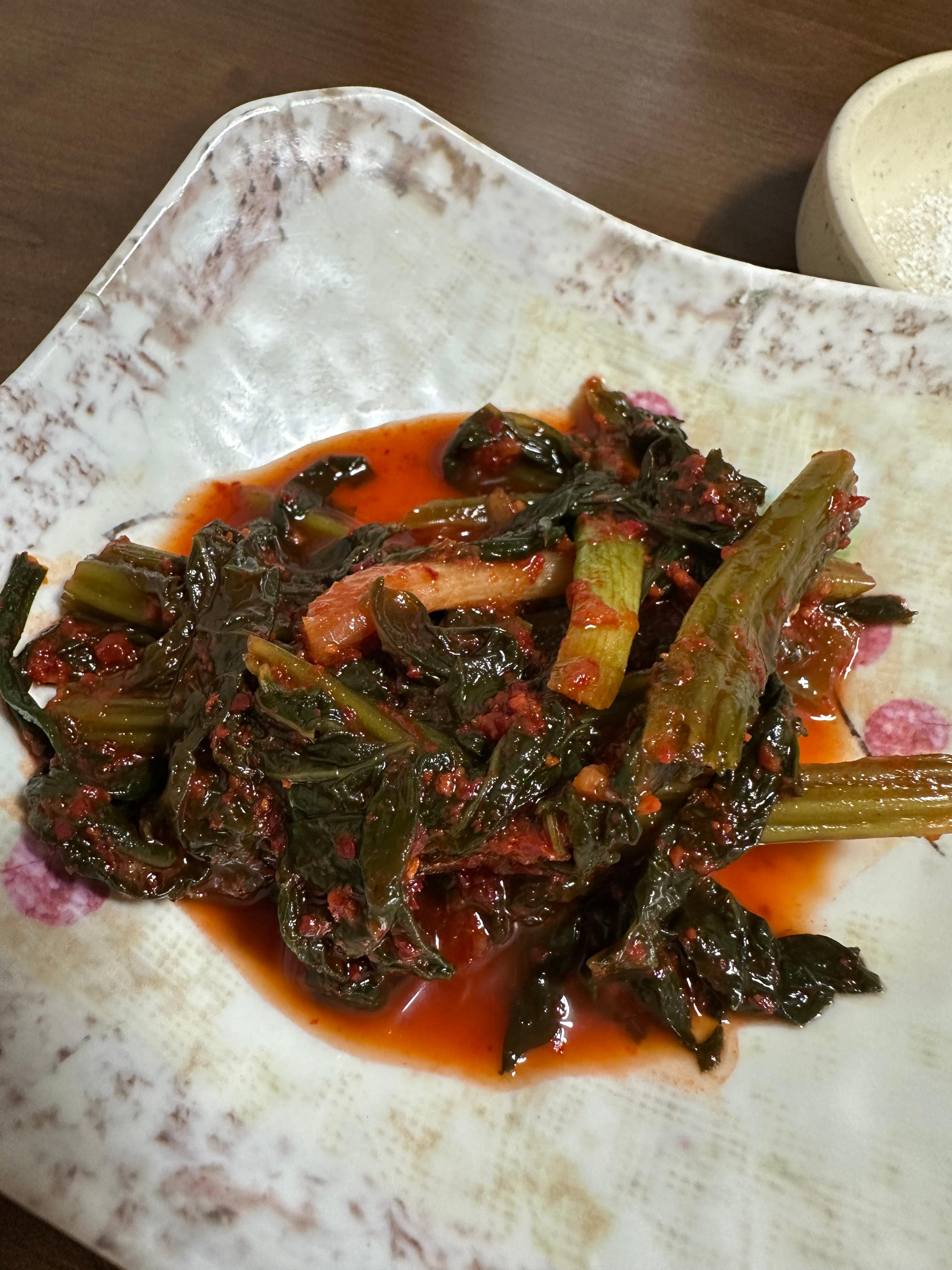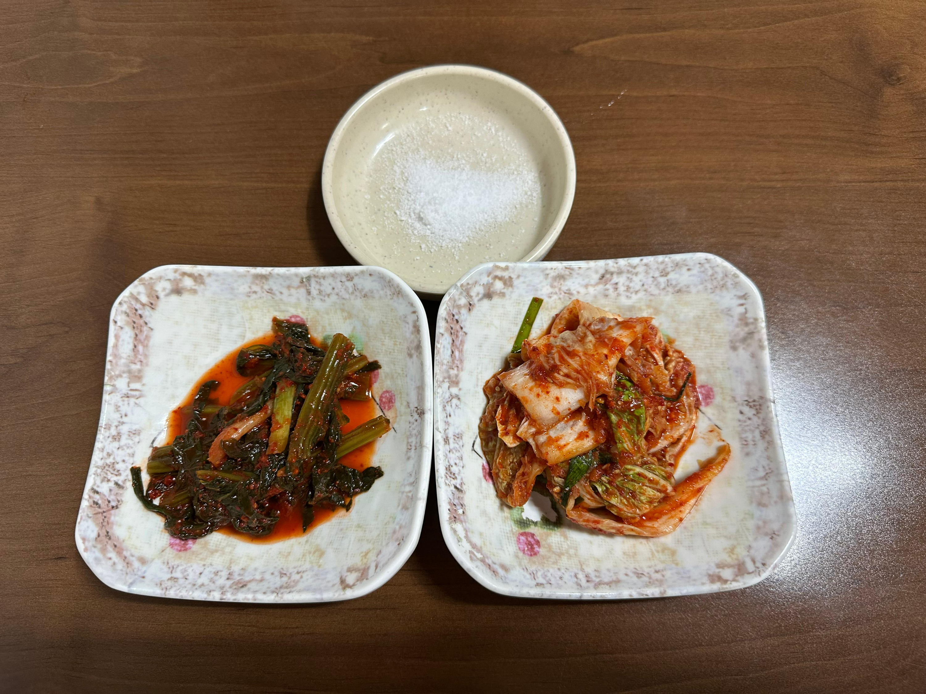 One is gat-kimchi (mustard leaf kimchi), and the other is geotjeori (fresh, lightly fermented kimchi).