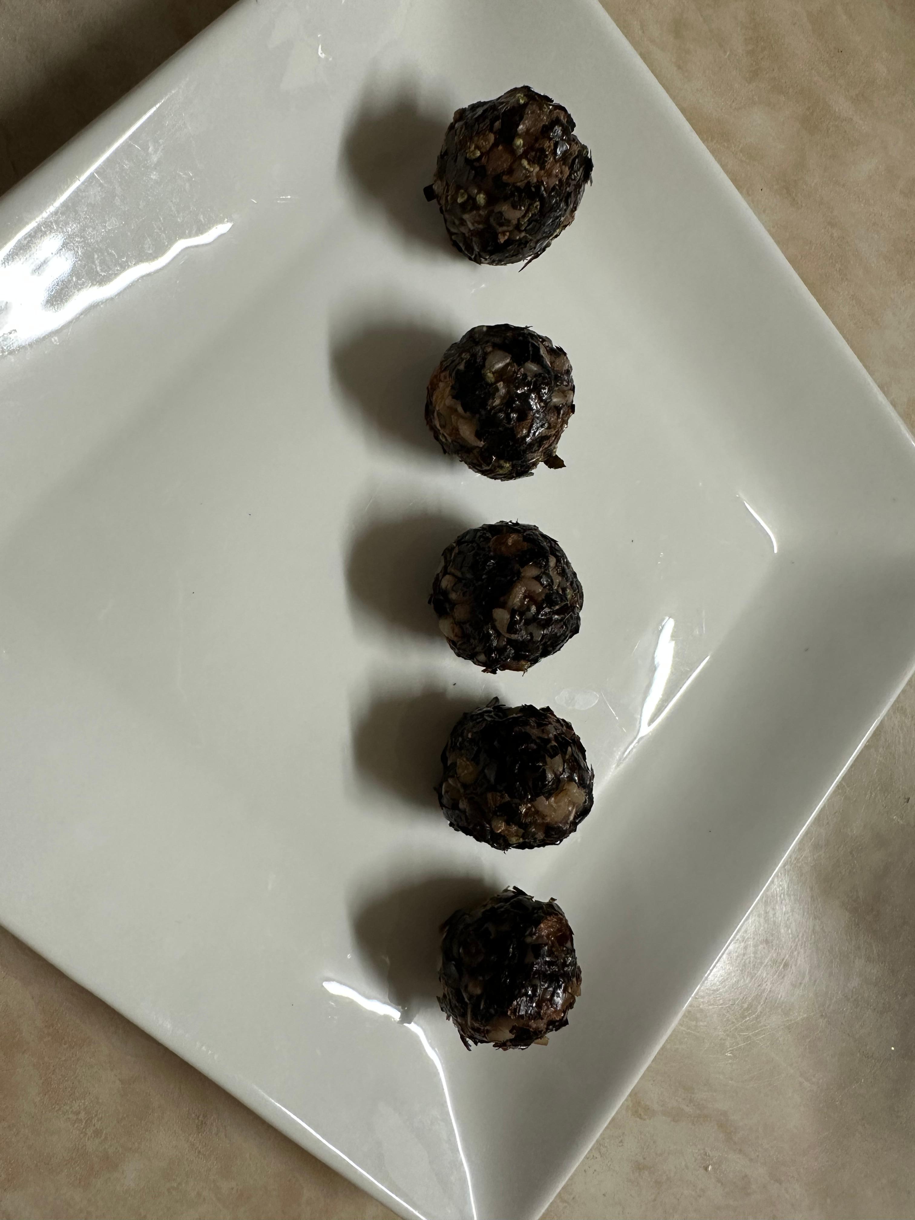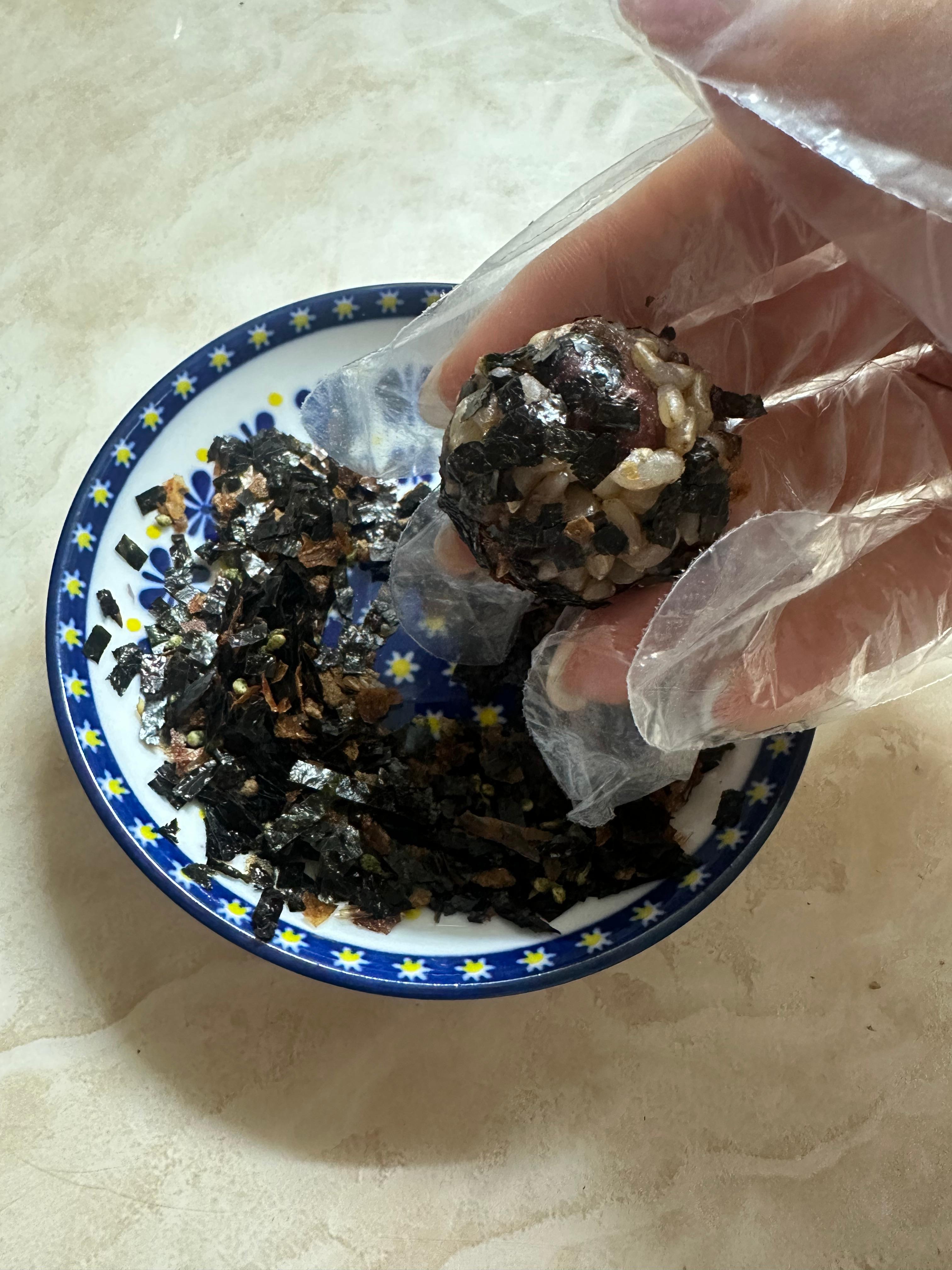 This time, I decided to use the seaweed furikake to make rice balls… I just took some rice and rolled it right into the furikake like this…