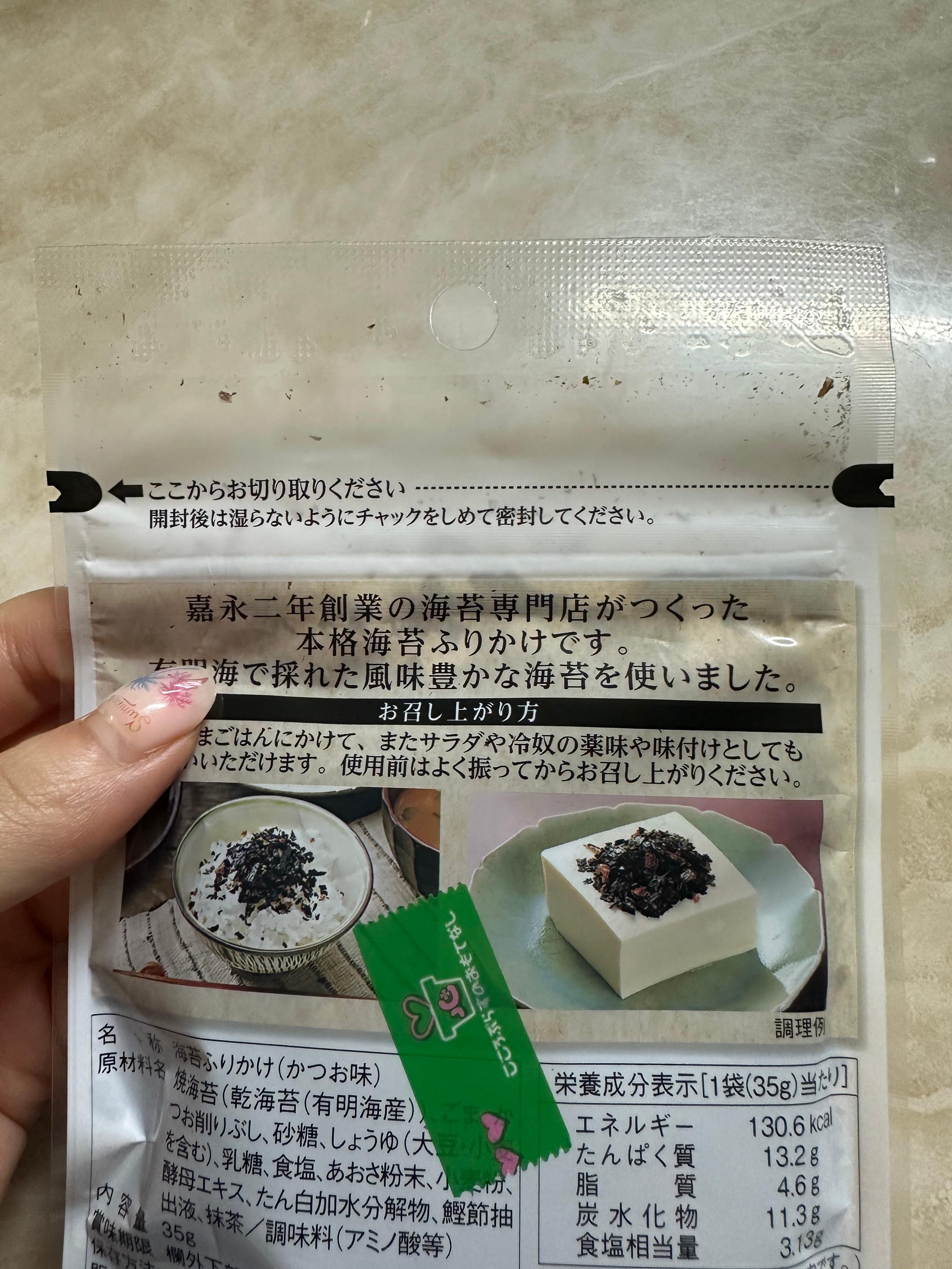 On the back of the package, all the important info is clearly listed — how to eat it, ingredient list, expiration date, and calorie information. It contains seaweed, bonito flakes, sesame seeds, and more.