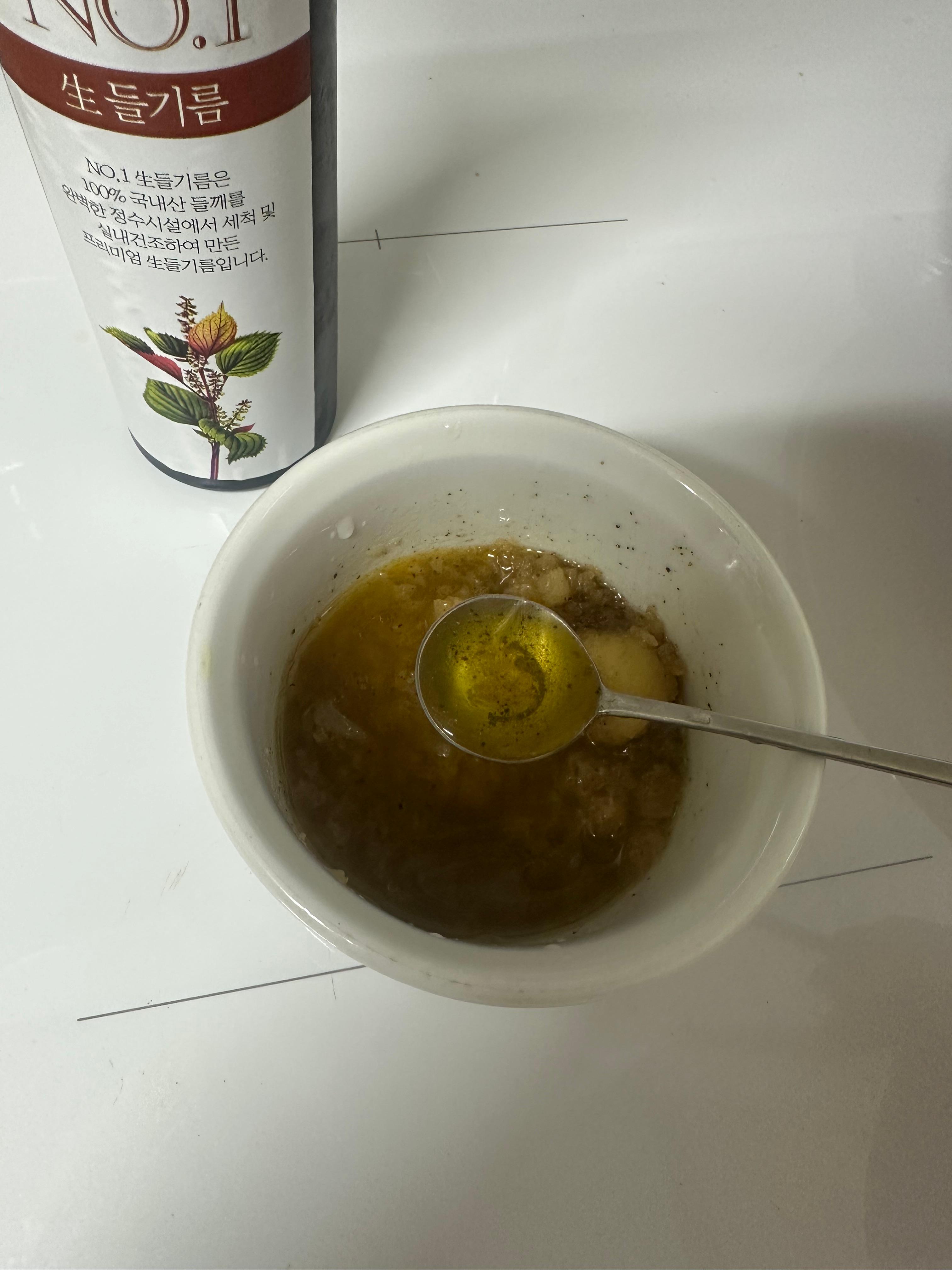 Minced garlic, soy sauce, olive oil, oligosaccharide (allulose), perilla oil - Chubby mom and her daughter used minced garlic, soy sauce, olive oil, lemon juice, black pepper, and raw perilla oil. |