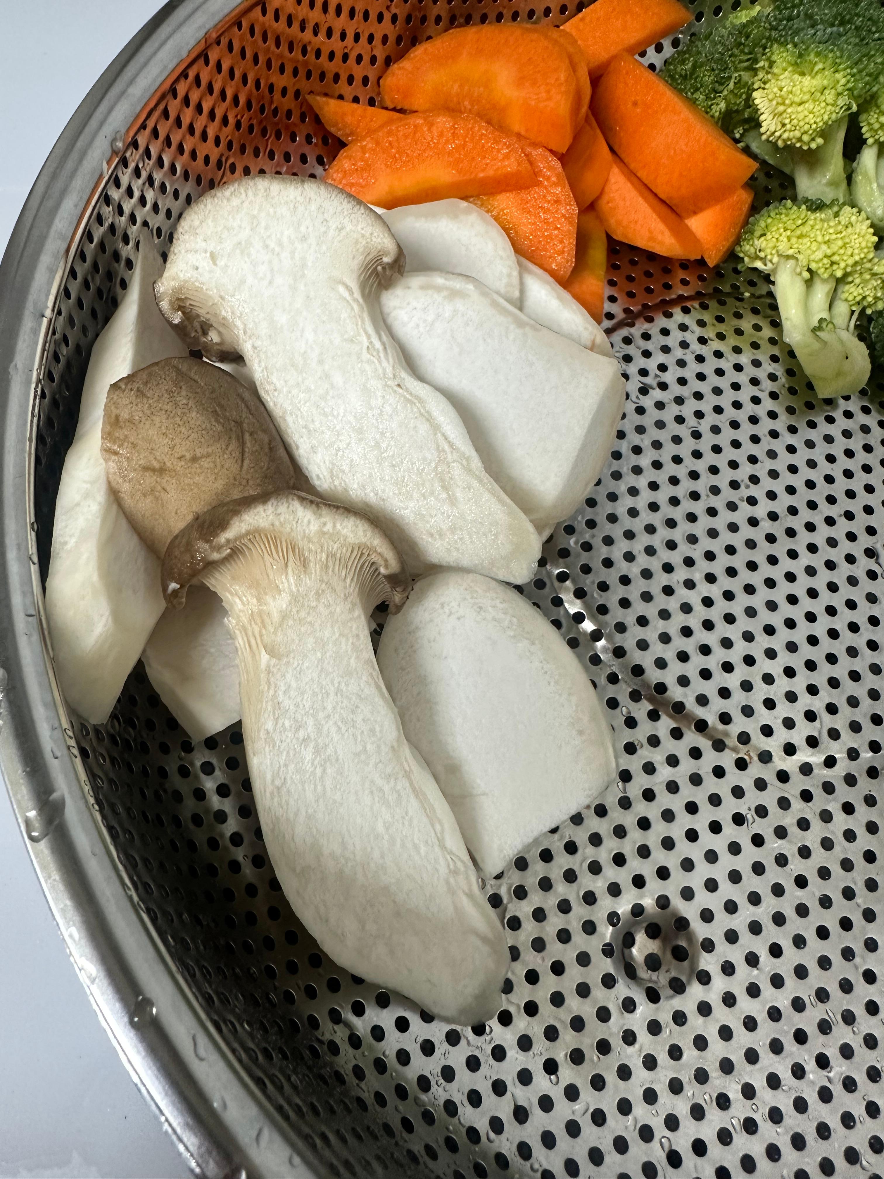 Chubby mom and her daughter usually start with broccoli and carrots, which they enjoy the most, and also add king oyster mushrooms. For mushrooms, you can use any type you like.