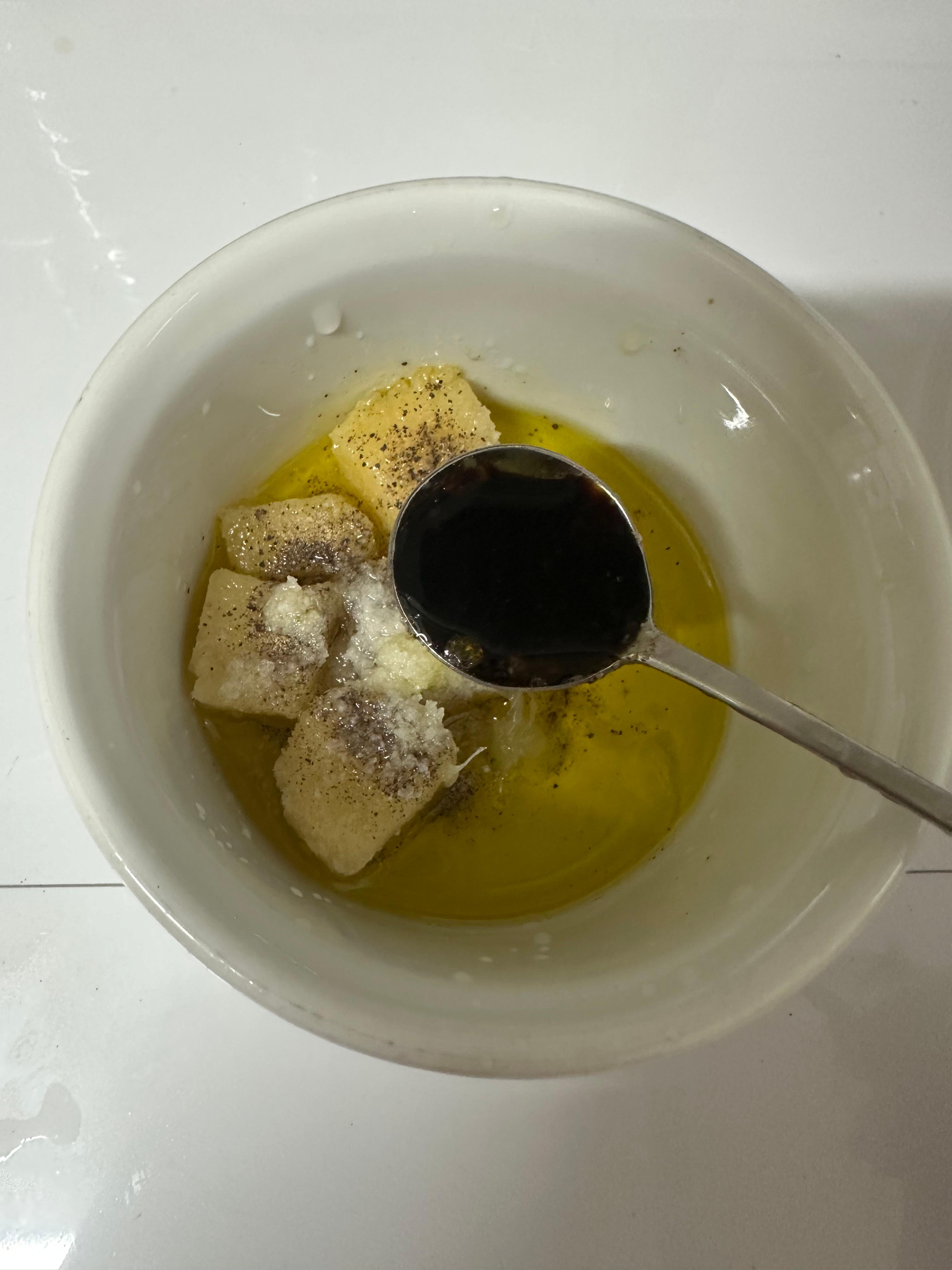 Making the dressing is simple. Just combine all the ingredients listed above and mix well. Chubby mom’s daughter used the following amounts (measured with a teaspoon): 3 tsp minced garlic, 5 tsp olive oil, a pinch of black pepper, 1 tsp lemon juice, and 1 tsp raw perilla oil.