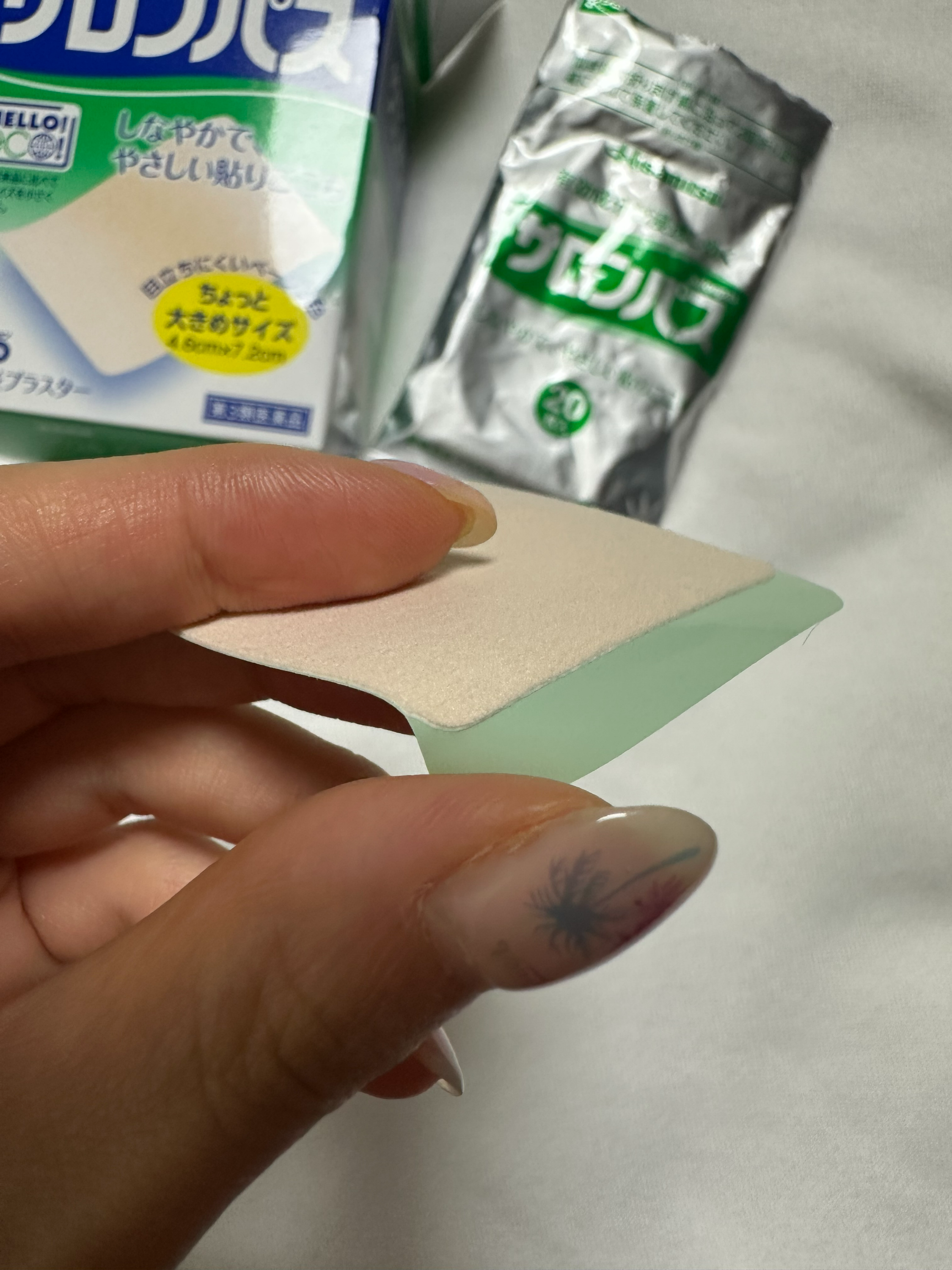 연두색의 필름은 이렇게 파스보다 약간 길게 나와있어서, 잡고 뜯기가 정말 수월하다. 살짝 구부려서 떼면 아주 부드럽게 잘 떼어진다.(이지피지!!!)