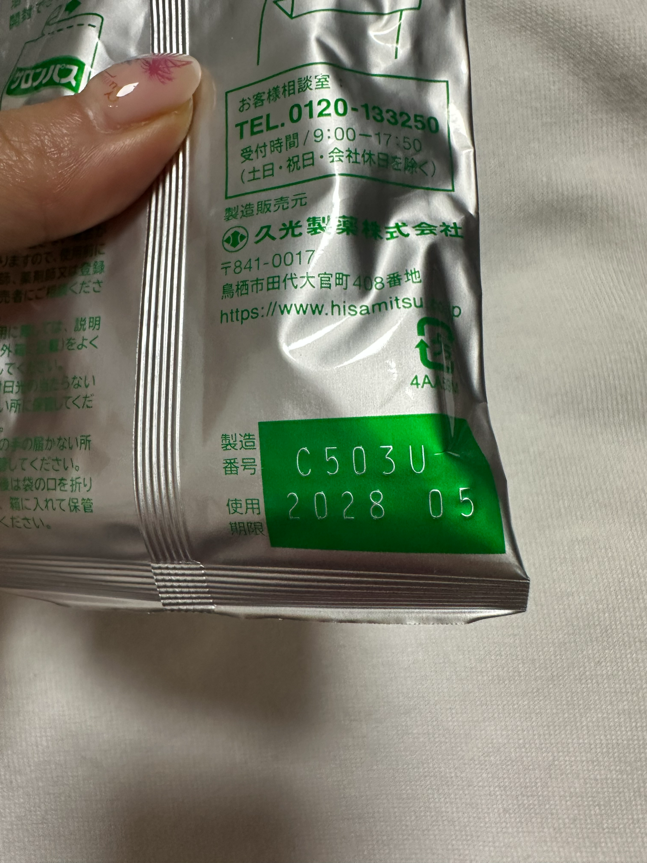 은색 봉지에는 이렇게 파스 20개가 들어있다는 표시가 되어있고 파스 봉지 윗부분은 이렇게 한 번 접혀져서 글루건같은 걸로 붙어져 있다.